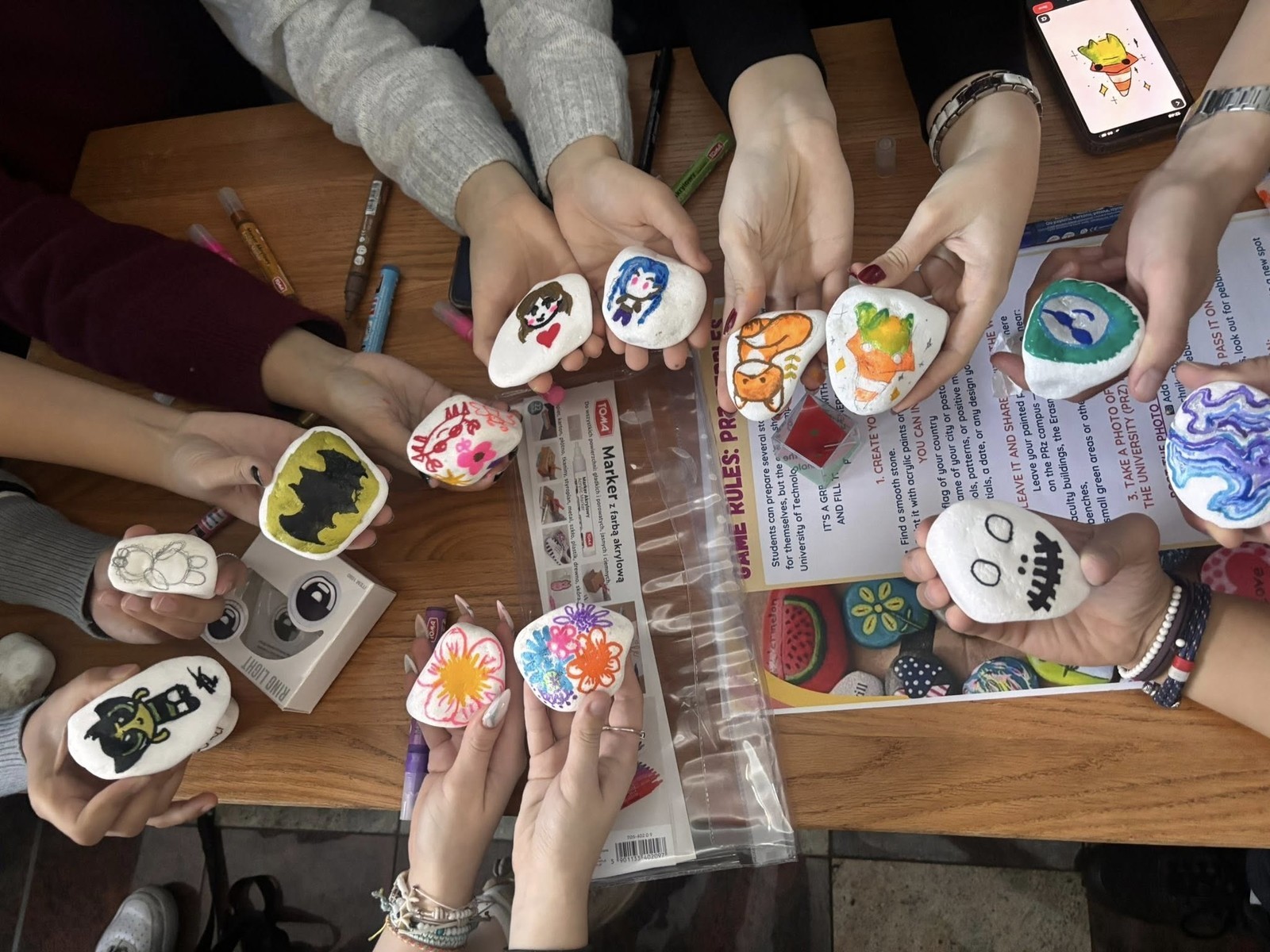Był to dzień pełen kolorów, radości i wspólnej zabawy. Podczas tego wyjątkowego wydarzenia studenci programu Erasmus pokazali swoją kreatywność, malując kamienie w barwach swoich krajów i ozdabiając je narodowymi symbolami. Dzięki mapom świata każdy mógł zaznaczyć swoje miejsce na globie, a przy okazji opowiedzieć swoją historię i poznać innych uczestników. To był dzień pełen uśmiechów, inspiracji i pozytywnej energii.