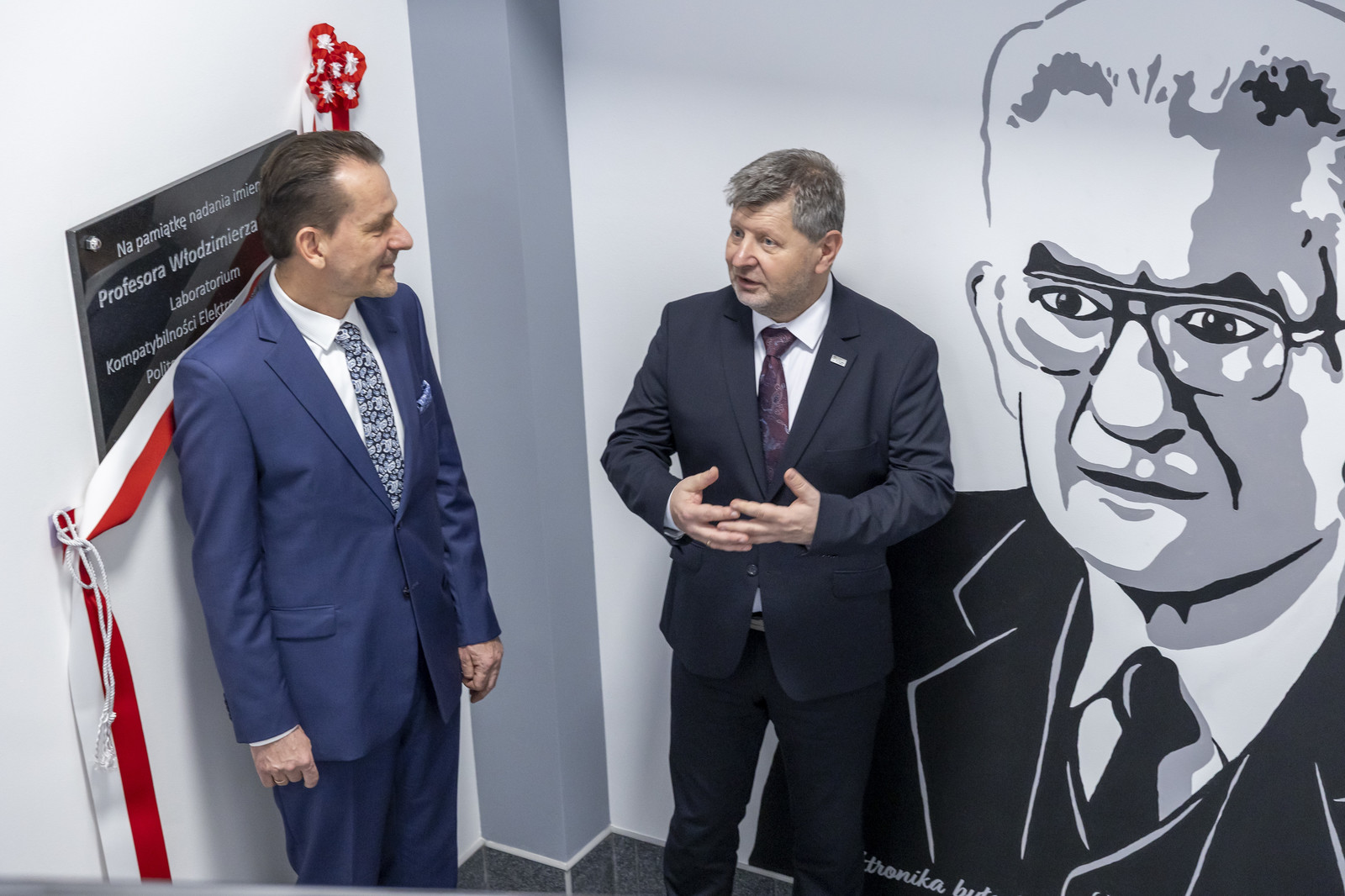 Na pamiątkę nieocenionych zasług prof. Włodzimierza Kality dla uczelni, wydziału oraz zakładu rektor prof. Piotr Koszelnik z Zofią Kalitą dokonali symbolicznego odsłonięcia tablicy pamiątkowej, która razem wizerunkiem Profesora uwiecznionym na muralu na długie lata pozostanie inspiracją dla obecnych i przyszłych członków społeczności akademickiej do angażowania się w rozwój i promowanie Politechniki Rzeszowskiej.