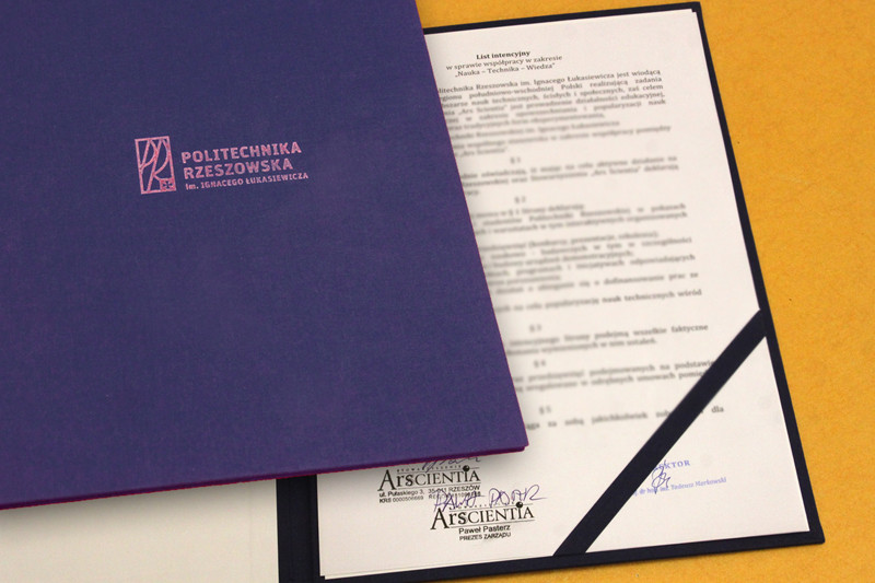 17 lipca br. Politechnika Rzeszowska podpisała list intencyjny ze Stowarzyszeniem „Ars Scientia”. Naszą uczelnię reprezentował dr hab. inż. Grzegorz Masłowski, prof. PRz, prorektor ds. kształcenia, a „Ars Scientice” Paweł Pasterz, prezes Zarządu Stowarzyszenia (autor i gospodarz programów „Radiolatorium” i „Nocy z gwiazdami” w Polskim Radiu Rzeszów) oraz Marlena Proszak, członek Zarządu Stowarzyszenia, dyrektor firmy POLIMEDIA.