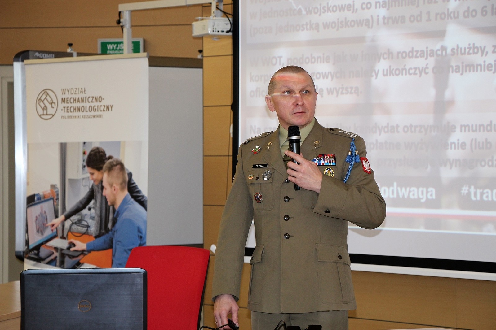 Zaproszonych gości przywitał dr hab. inż. Aleksander Mazurkow prof. PRz, dziekan Wydziału Mechaniczno–Technologicznego PRz w Stalowej Woli. Płk. Dariusz Słota, dowódca 3 Podkarpackiej Brygady Obrony Terytorialnej mówił o obowiązkach i korzyściach wynikających z połączenia studiów i służby w WOT. O tym, jak w praktyce wygląda łączenie studiów ze służbą wojskową mówił Przemysław Szpila, student Wydziału Mechaniczno-Technologicznego i szeregowy Wojsk Obrony Terytorialnej.