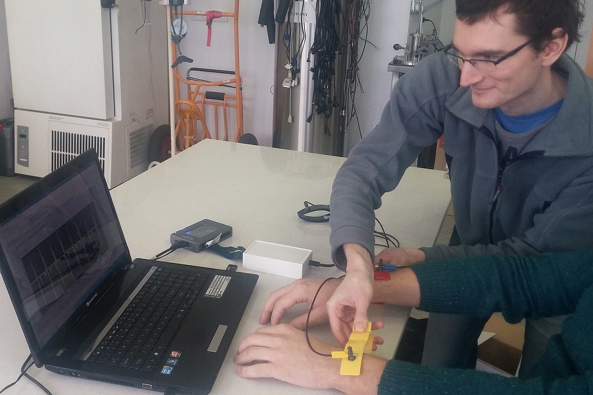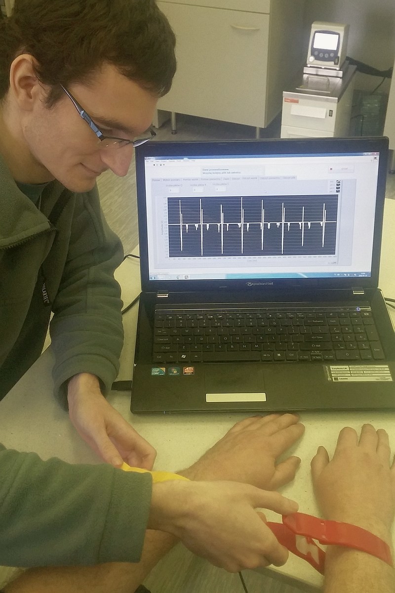 W ramach prac inżynierskich studenci realizowali bardzo praktyczne projekty. Michał Wanic przygotował pracę pt. „Budowa stanowiska badań i analizy potencjałów sercowych (EKG)”. Praca polegała na zbudowaniu układu pomiarowego do mierzenia sygnału EKG oraz stworzenia aplikacji w graficznym środowisku programowania LabVIEW. System ten oparty jest na metodzie trzypunktowej i składa się z dedykowanego układu odpowiadającego za wzmocnienie sygnału EKG. Program stworzony przez studenta, umożliwia obserwowanie zapisu elektrokardiografii w czasie rzeczywistym wraz z obliczaniem tętna, a także jego dokładną analizę. Opiekunami pracy byli dr inż. Gaweł Żyła, pracownik Laboratorium Fizyki Miękkiej Fazy Skondensowanej oraz mgr inż. Jacek Fal.